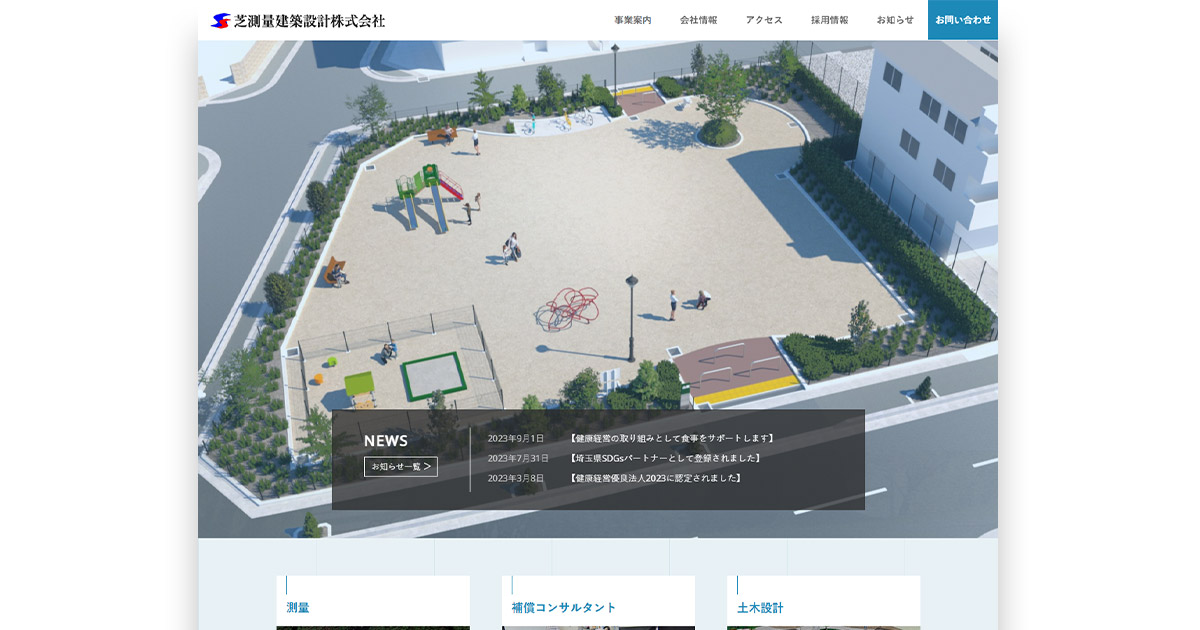 芝測量建築設計株式会社様のホームページを制作させていただきました。 サイトを見る Project overview Project type : コーポレートサイト制作 Industry : 土木・測量 Client address : 埼玉県川口市 Production : 企画・設計・デザイン・コーディング・CMS構築 投稿日:2019/03/31 カテゴリー:Webデザイン|制作実績 タグ:Webサイト