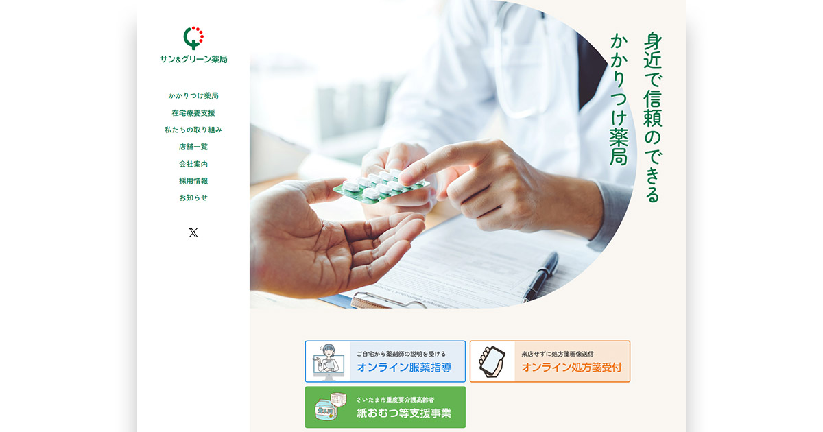 サン&グリーン薬局様のホームページを制作させていただきました。 サイトを見る Project overview Project type : 施設・店舗サイト制作 Industry : 製薬・福祉 Client address : 埼玉県さいたま市 Production : 企画・設計・デザイン・コーディング・CMS構築 投稿日:2025/01/22 カテゴリー:Webデザイン|制作実績 タグ:Webサイト